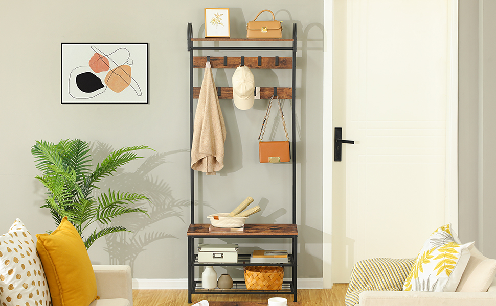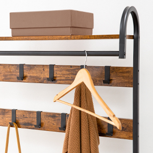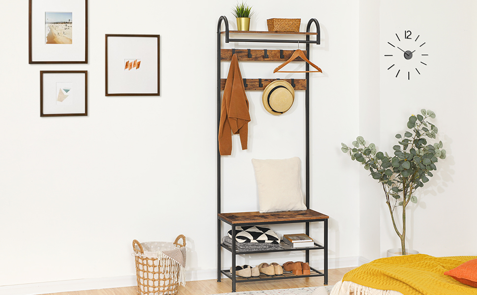 Идеално се вписва в малки помещения и не изпъква прекалено, така че да пречи, но въпреки това има достатъчно място да седнете, докато си обувате обувките. Куките държат всичко, което пожелаете, и могат да се преместват според нуждите ви.