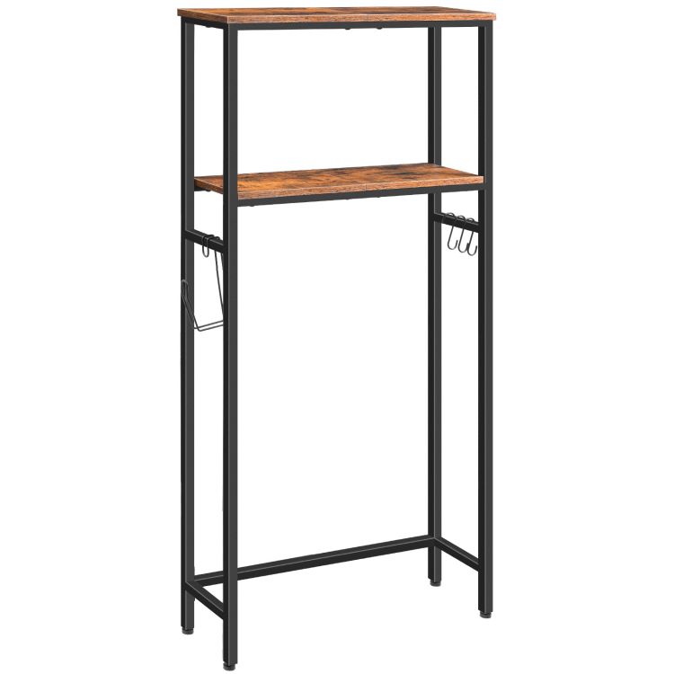 Класическата комбинация от рустикално кафяво и черно придава индустриален стил и топлина. Тази двуетажна етажерка изглежда модерно, докато организира всичко в банята или добавя зеленина и декорации в други кътчета от дома.