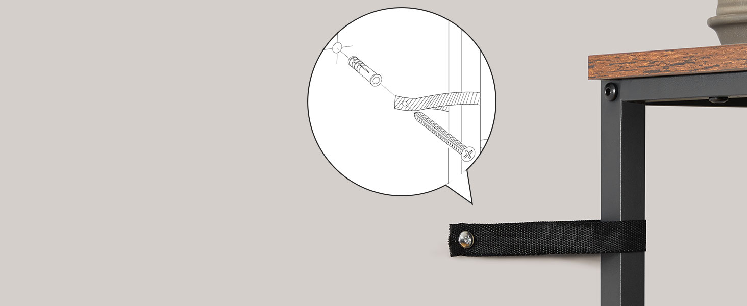 Изработен от висококачествен ПДЧ и черна метална рамка, рафтът е стабилен и издържа до 15 кг на рафт. Анти-накланящ комплект и регулируеми крачета осигуряват допълнителна защита и стабилност върху различни повърхности.
